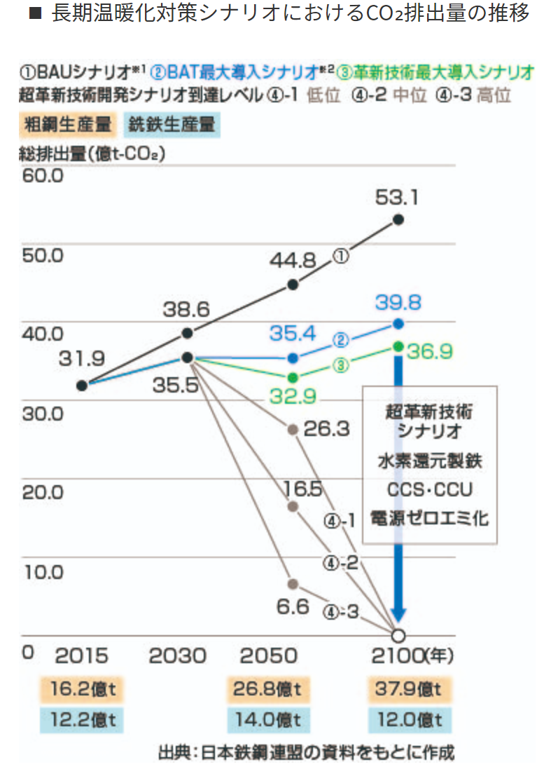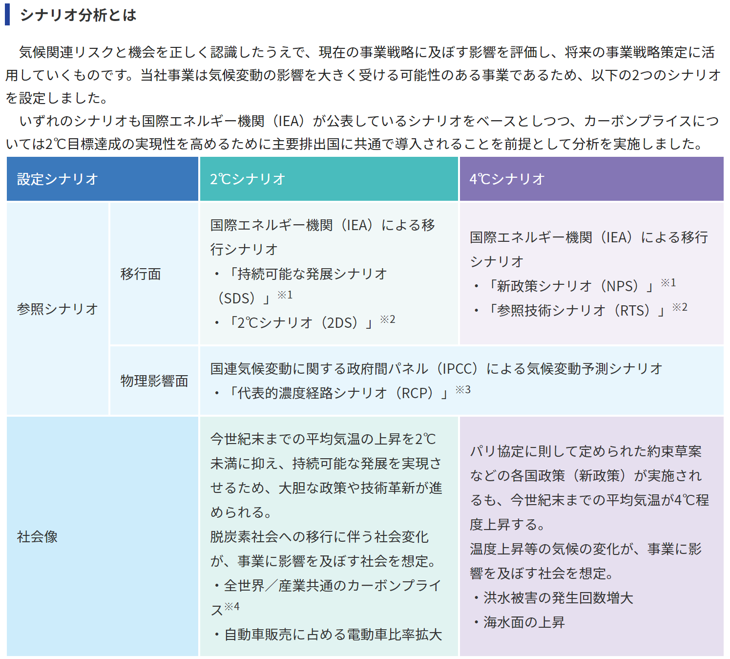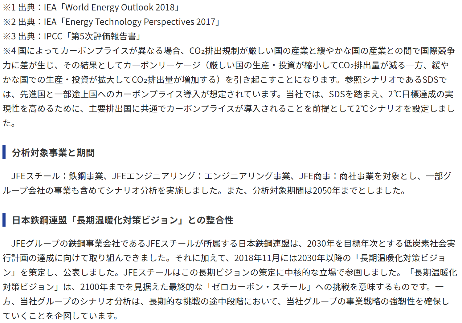 JFEホールディングスは2℃シナリオ(パリ協定で合意された脱炭素社会)と4℃シナリオ(このまま特段の対策をとらない社会)の2つのシナリオに沿った分析を開示しています。自社の分析のほか、業界団体(日本鉄鋼連盟)によるシナリオも記載しています。