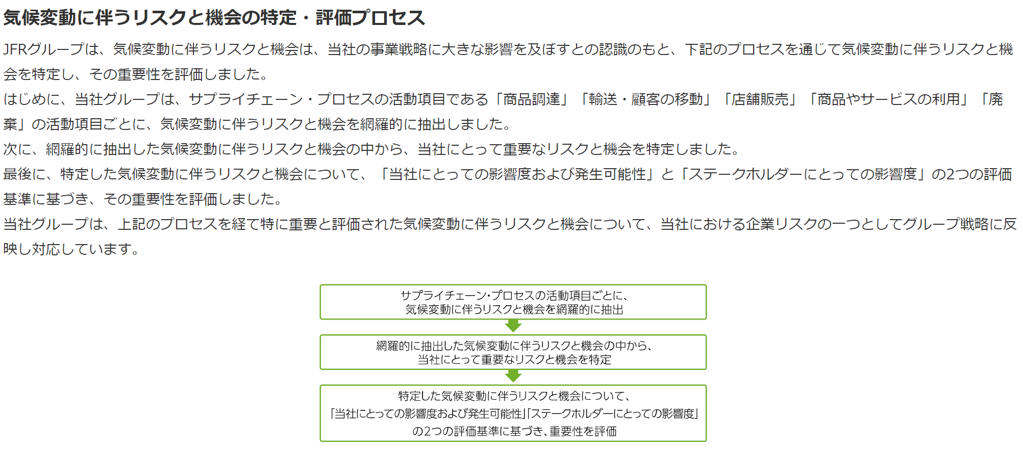 Jフロントリテイリングは、全社リスク管理とは別に気候変動リスク分析を実施し、そのプロセスを開示しています。