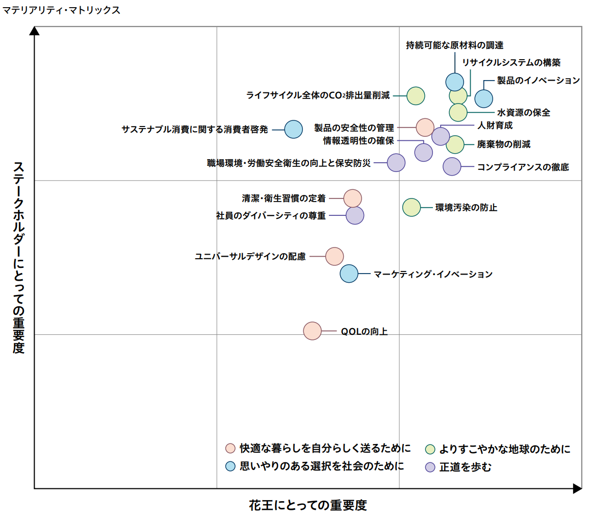 花王は重点的に取り組むテーマの評価(マテリアリティ分析)を実施したうえで、気候変動関連テーマである「ライフサイクル全体のCO2排出量削減」について、他のサステナビリティ関連のテーマとの比較の中で相対的な重要性を示しています。