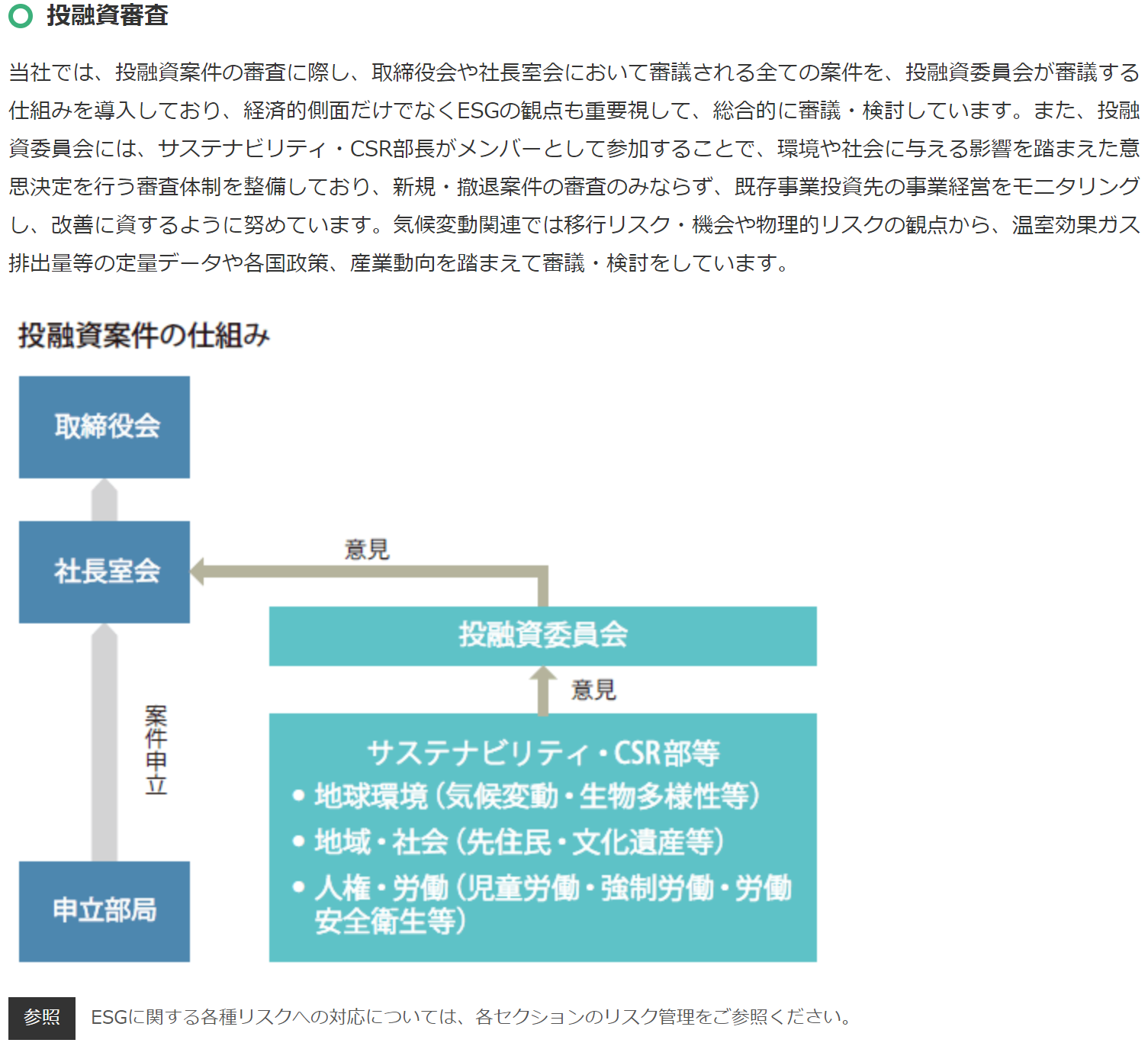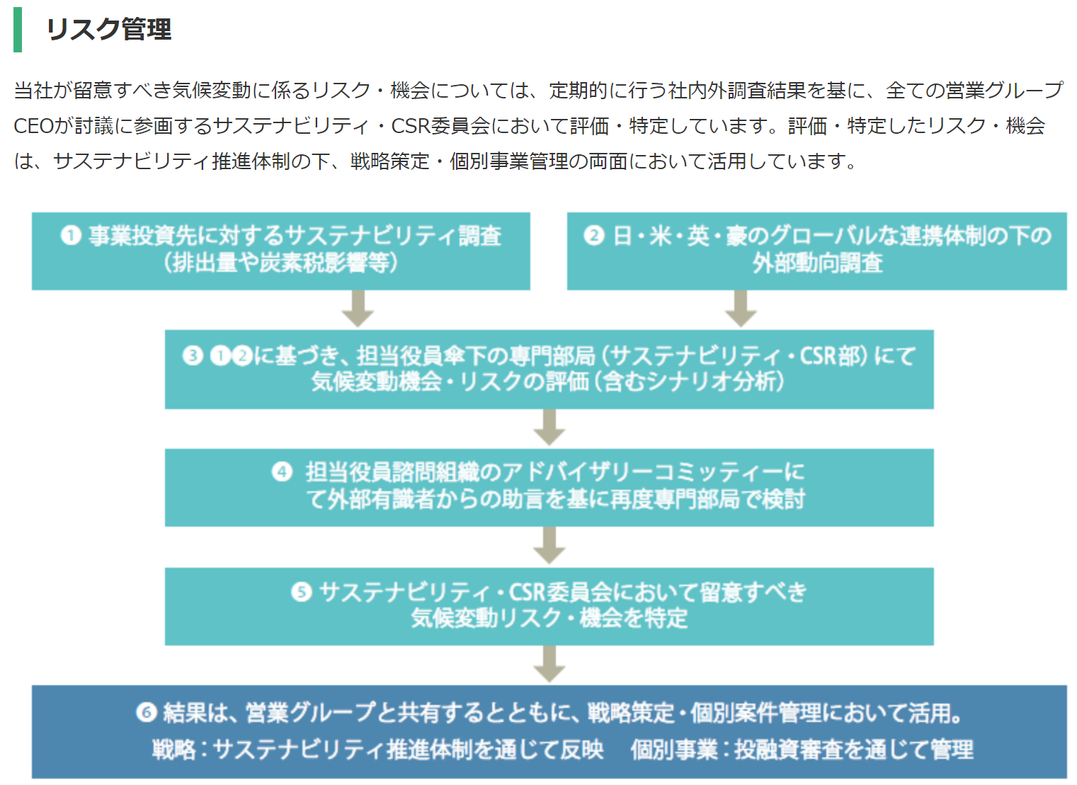 三菱商事は気候変動リスクの管理プロセスと、それを既存のリスク管理プロセスにどのように統合しているかをチャートで示しています。