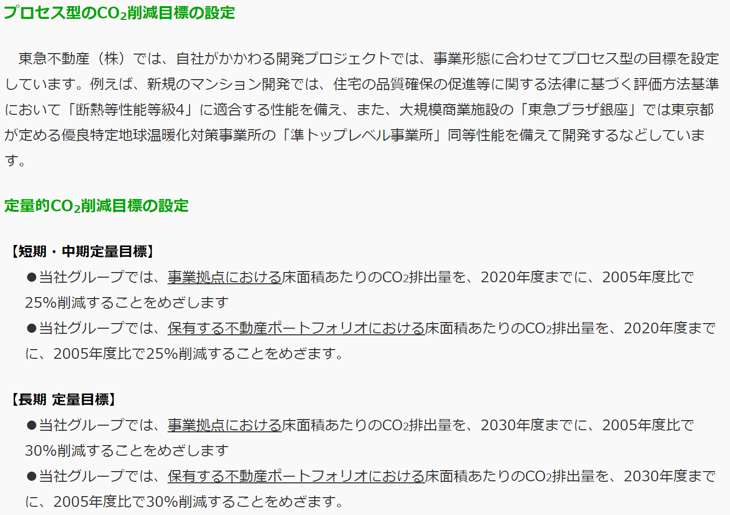 東急不動産ホールディングスでは、環境配慮基準を満たした建物の開発、事業拠点における床面積あたりのCO₂排出量、保有する不動産ポートフォリオにおける床面積あたりのCO₂排出量といった不動産業界特有の指標をKPIとしています。
