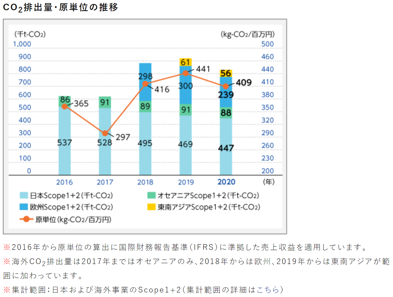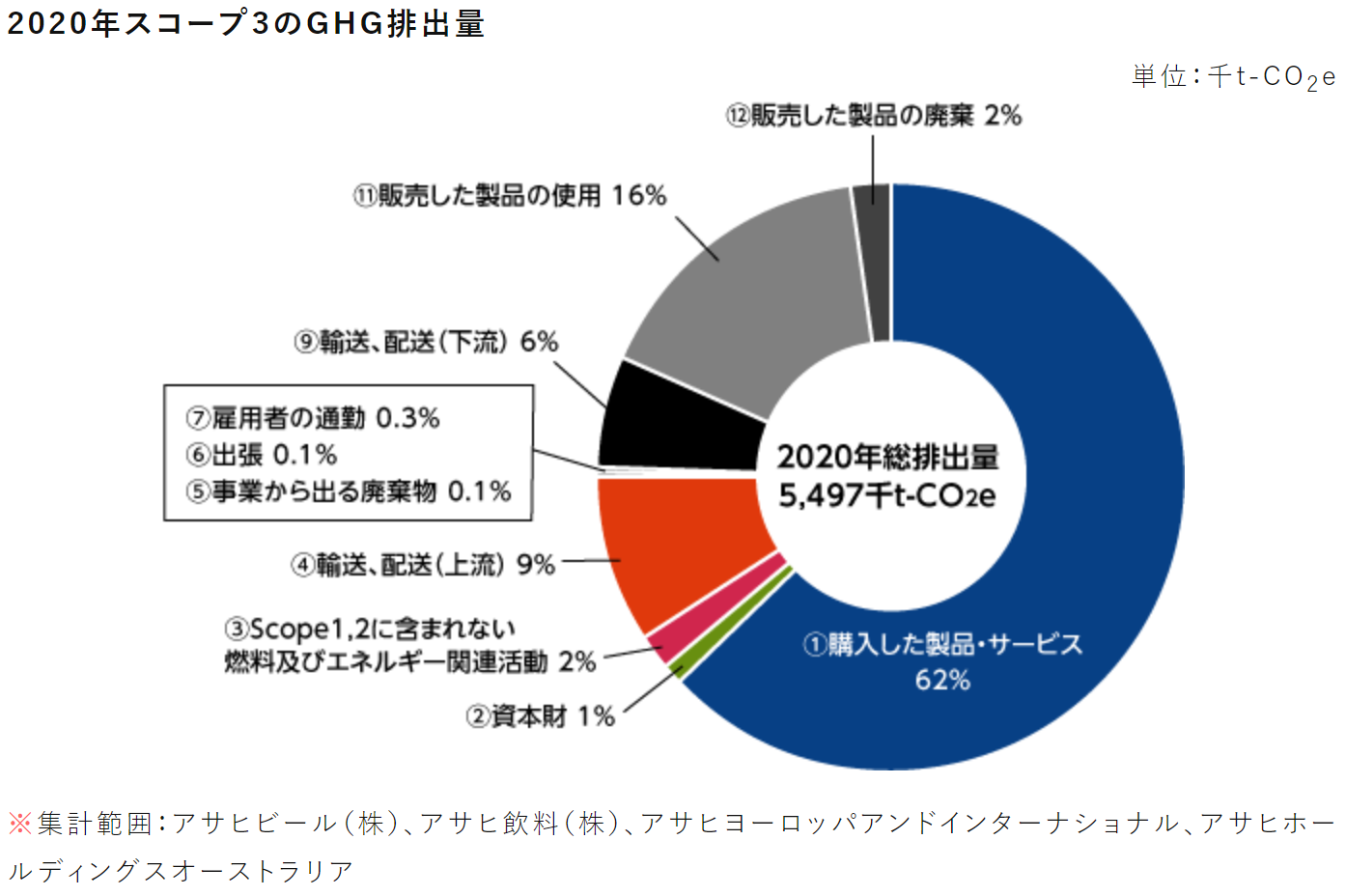 アサヒグループホールディングスはCO2排出量(スコープ1+2)実績を2020年から過去5年分グラフで開示しています。排出総量と併せて売上高あたり原単位も示すことで、環境効率も明示しています。スコープ3は自社に関連のあるカテゴリーのみ開示し、影響度の大きさを円グラフでも示しています。