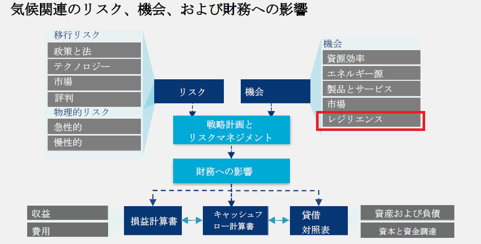 レジリエンス(resilience)が「回復力」「弾性(しなやかさ)」と訳され、気候変動関連情報の開示においては、一般的には「気候変動の悪影響に対する脆弱性を減らしつつ、事業の“復元力” や“しなやかな強靭さ”を持つこと」と理解されている。この意味におけるレジリエンスは「リスク」への対応という面が強調されがちだが、TCFD提言においては下図のとおり気候変動に伴う「機会」の文脈でも用いられている。