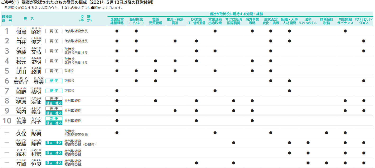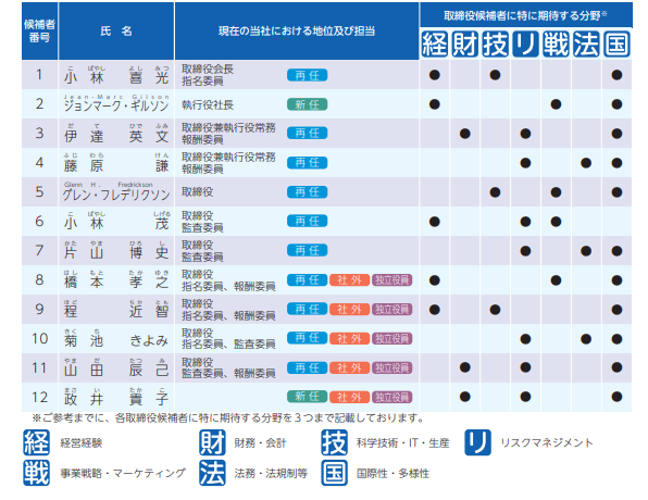 ただし、ニトリホールディングスのスキル・マトリックスでは「各取締役が保有するスキル等のうち、主なもの最大7つに●印を付けています」との断り書きを入れています。これは、●をつけすぎると、各取締役に特に期待する役割が見えにくくなりかねないことを考慮したものと思われます。スキル項目の数にもよりますが、各取締役等につける●の数は、全スキル項目の半分、多くても3分の2以内にとどめたいところです。ニトリホールディングス以外でも、上記で紹介した富士フイルムホールディングスでは「(6項目中)4つまで」で、資生堂では「(6項目中)最大3つまで」との記載が見られます。特に専門性が高く、自社が期待する役割に●をつけているということを明確にするための記載と言えるでしょう。