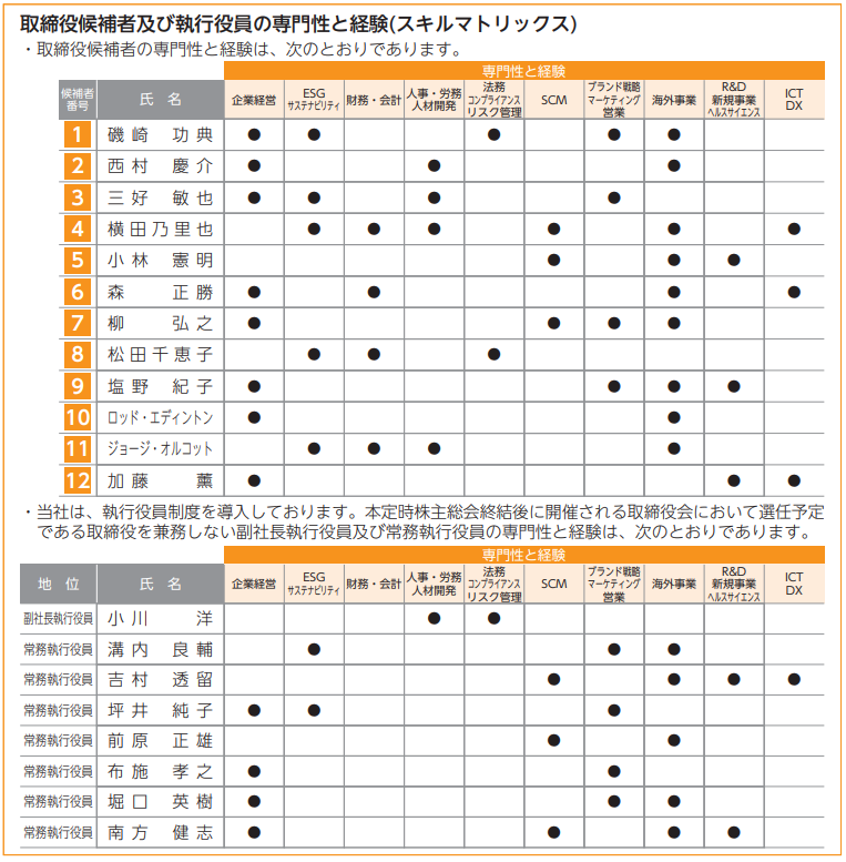 また、同じく監査役会設置会社であるキリンホールディングスのように、取締役のみならず執行役員のスキル・マトリックスも示すことで、執行機能(執行役員)と監督機能(取締役会)のバランスが確保されていることを示している事例もあります。キリンホールディングスのスキル・マトリックスを見ると、「ESG、サステナビリティ」「財務・会計」「人事・労務、人材開発」「法務、コンプライアンス、リスク管理」など「監督執行機能」に関する項目には比較的取締役会のメンバーに●が付いているのに対し、「ブランド戦略、マーケティング、営業」「R&D、新規事業、ヘルスサイエンス」といった項目では執行役員に多くの●が付いています。上述のとおり機関設計を問わず取締役会に求められるスキルである「経営」については、取締役会のメンバー、執行役員ともに多くの●が付いています。同様に「海外事業」にも多くの●が付いているのは、海外事業に力を入れて行こうという同社の経営戦略の表れと言えるでしょう。