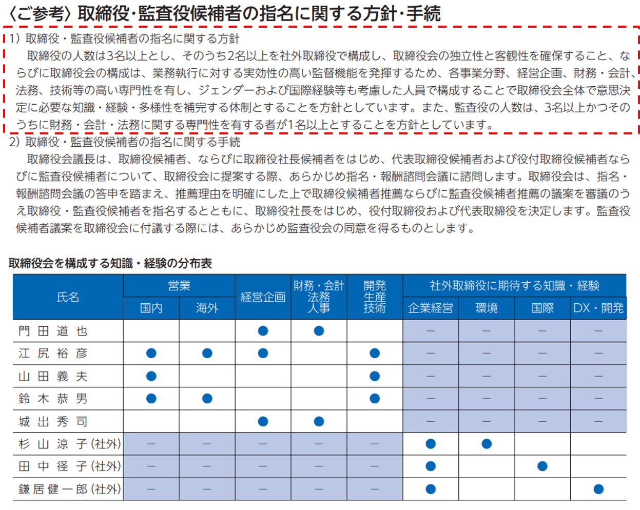 | 取締役会は、経営戦略に照らして自らが備えるべきスキル等を特定した上で、取締役会の全体としての知識・経験・能力のバランス、多様性及び規模に関する考え方を定め、各取締役の知識・経験・能力等を一覧化したいわゆるスキル・マトリックスをはじめ、経営環境や事業特性等に応じた適切な形で取締役の有するスキル等の組み合わせを取締役の選任に関する方針・手続と併せて開示すべきである。その際、独立社外取締役には、他社での経営経験を有する者を含めるべきである。 |