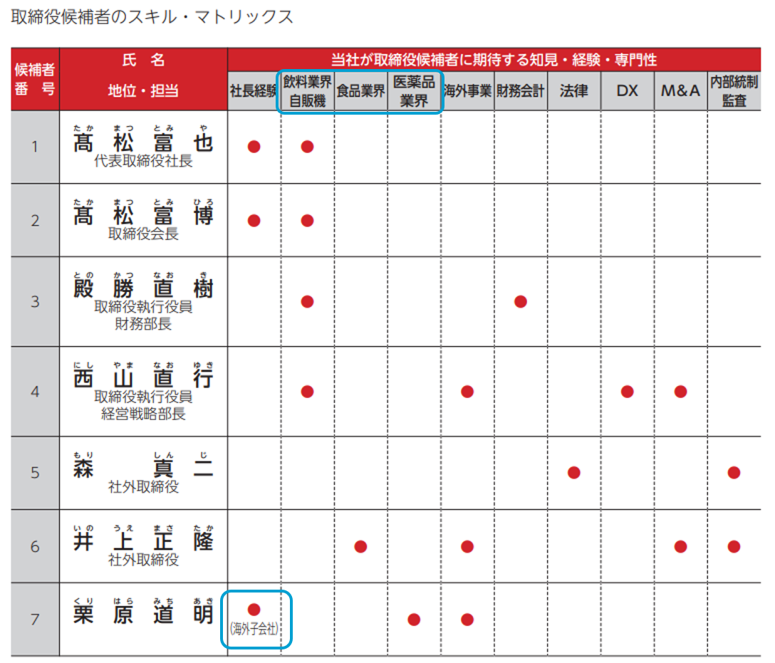 また、上述のとおり「イノベーション」というスキル項目を設けている企業が散見されますが、これがどのようなスキルを指すのかは必ずしも明確ではありません。そこで第一生命は「イノベーション」というスキル項目にカッコ書きで「新規事業開拓」と追記しています。このほか、ダイドーグループホールディングスでは、「営業」というスキル項目を「国内」と「国外」に分け、「社長経験」というスキル項目では、それが海外子会社の社長経験である取締役については●の下にカッコ書きで「海外子会社」と付記しています。このように簡単な説明を付記するだけでも読み手の理解度が大きく変わってくるので、スキル・マトリックスを作成する企業は参考にしたいところです。