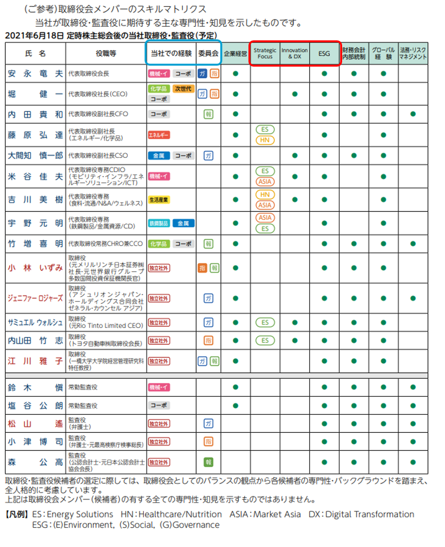 もっとも、事業の数があまりにも多い場合、それぞれをスキル項目として表示するのは困難です。こうした場合、参考になるのが三井物産の事例です。同社は「当社での経験」というスキル項目を設けたうえで、各取締役・監査役ことに、「化学品」「エネルギー」「金属」「生活産業」「鉄鋼製品」など、担当事業を具体的に示しています。