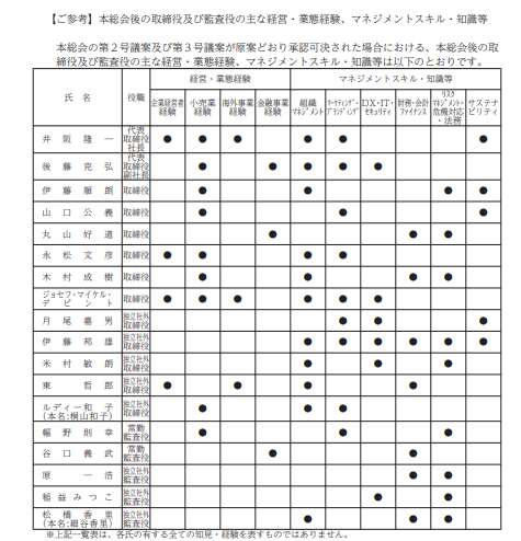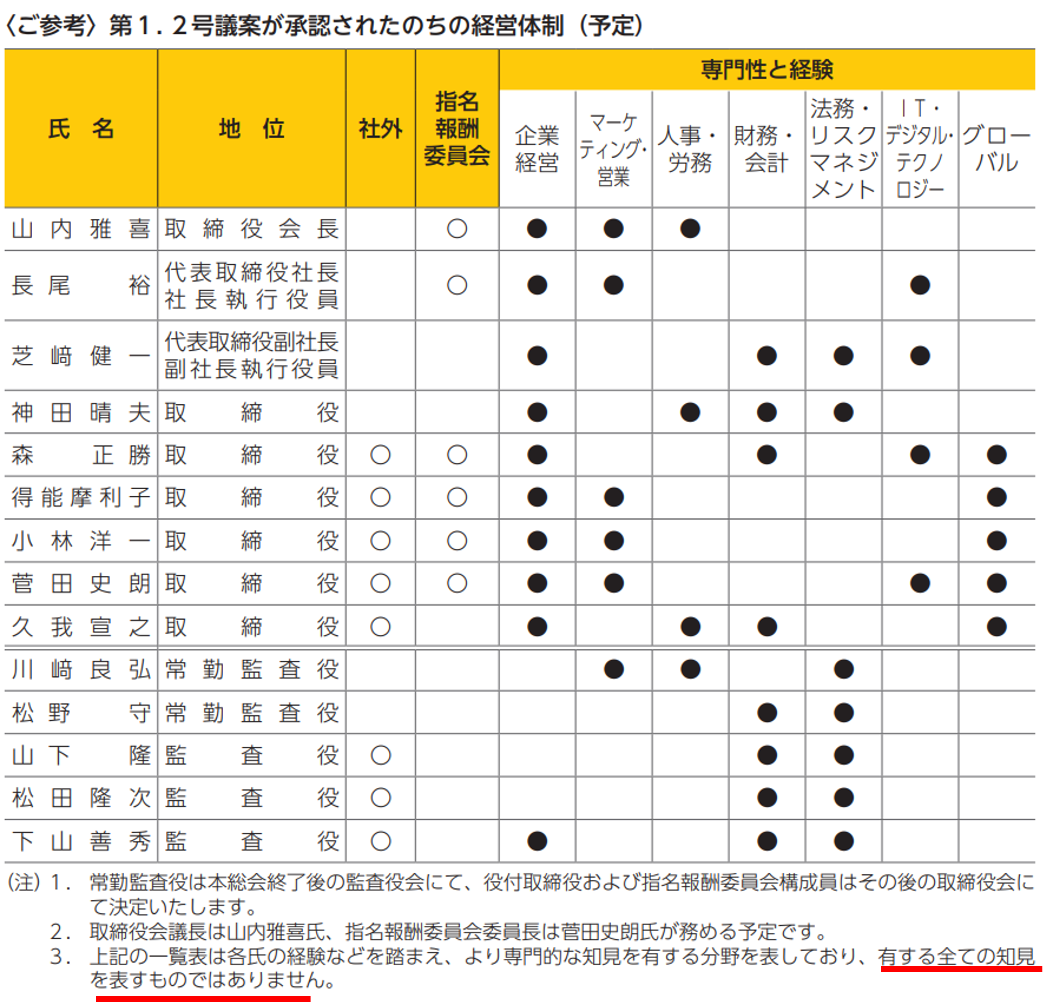 また、富士フイルムホールディングスやヤマトホールディングスのスキル・マトリックスでは、「各取締役が有する全ての知見や経験を表すものではない」との断り書きを入れています。この記載は「●がついていない項目や、そもそもスキル項目として挙げられていない分野について知見や経験がないということではない」ことを明確にする趣旨と考えられ、各取締役(特に社外取締役)に配慮したものと言えそうです。