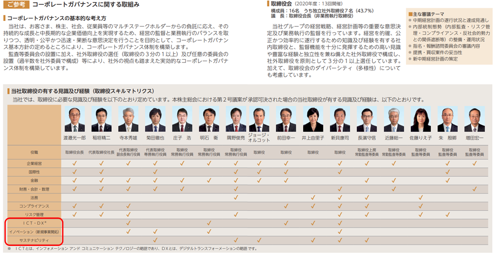 ここまでいくつかの企業のスキル・マトリックスを紹介してきましたが、スキル項目としてほとんどの企業が挙げているのが「DX」です。これは今年からの傾向ですが、「投資家と企業の対話ガイドライン」に「DXの進展が経営戦略・経営計画等において適切に反映されているか」との一文が盛り込まれた(下記赤字部分参照)ことを先取りした動きとも言えそうです。