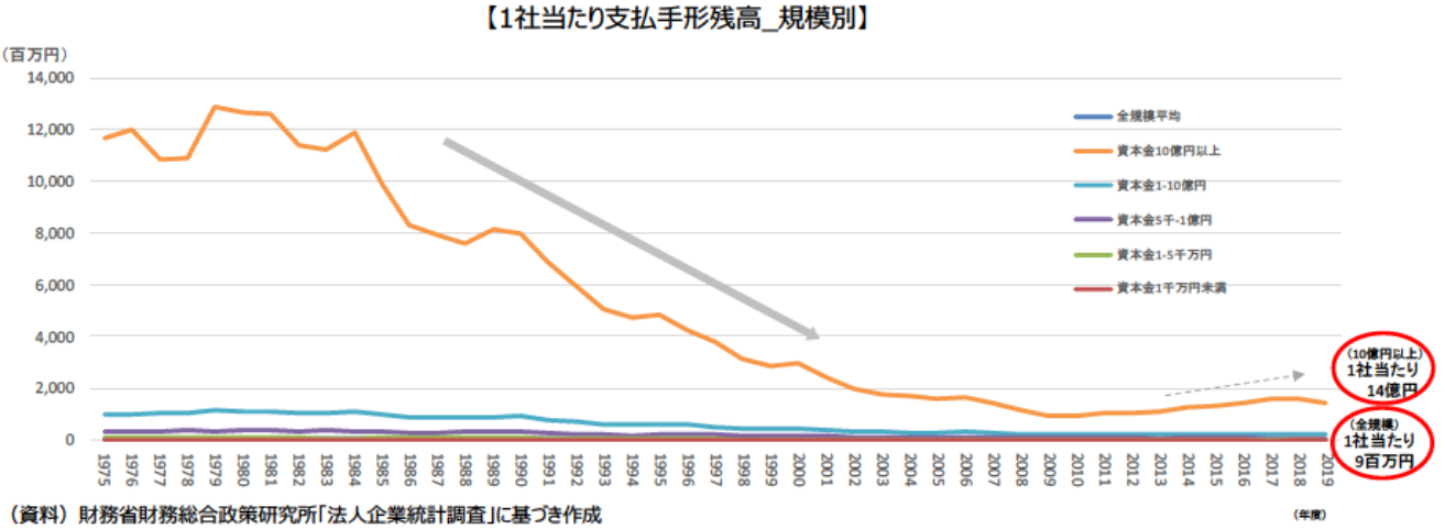 わが国ではサプライチェーン全体にわたる取引環境の改善が課題になっており、政府は2016年9月に「未来志向型の取引慣行に向けて」を公表し、型取引の適正化や約束手形の現金払化などに取り組んでいます(「未来志向型の取引慣行に向けて」については2018年1月11日のニュース「“世耕プラン”に基づく中小企業と大企業の取引慣行の改善が進まない理由」を参照)。このうち型取引の適正化については中小企業庁に設置された型取引の適正化推進協議会が2019年12月に「型取引の適正化推進協議会 報告書」を公表済みです(2020年1月10日のニュース『「型」の保管料を発注側が負担すべき類型と廃棄時期の目安』を参照)。また、約束手形の現金払化については、50年ぶりの手形通達の改正(2016年12月)、下請中小企業振興法 「振興基準」の改正(2018年12月)、自主行動計画を策定する団体数の増加(2021年2月末時点で16業種49団体)とフォローアップ調査の実施などの取り組みを進める中、手形交換枚数が減少を続けるなど、支払条件の着実な改善が見られているところです。その一方で、中小企業庁は支払サイトの業界毎の長期硬直化や下請事業者への割引料負担の偏在などの新たな課題も把握されてきているとして、約束手形をはじめとする支払条件の改善に向けた検討会を設置し、2021年3月に「約束手形をはじめとする支払条件の改善に向けた検討会報告書」(以下、本報告書)を公表しました。本稿では、本報告書をもとに手形払いの問題点や現金払化への取組みについて解説します。