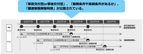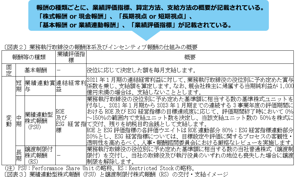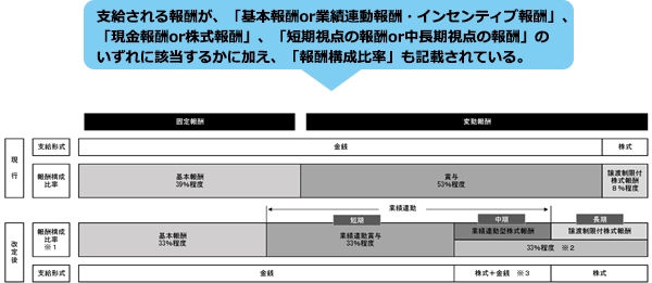 (注)2020年11月6日、金融庁は報酬プログラムの開示において「取締役の個人別の報酬等に係る決定方針又は報酬委員会による報酬の決定の方法を定めている場合には、その内容を記載する」ことを求める開示府令の改正案を公表している。