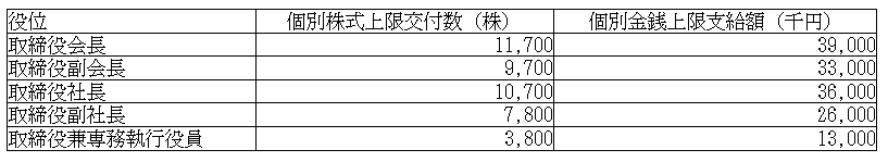 当社普通株式の総交付数の上限は、1)108,000株、2)下表ⅱに役位別に定める個別上限株式数に本有価証券報告書提出時における役位毎の員数を乗じて合計した数、のいずれか少ない数を上限とします。