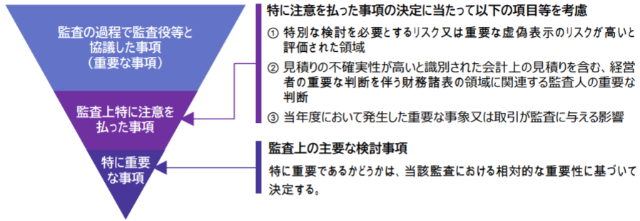 等について考慮した上で特に注意を払った事項を決定し、当該決定を行った事項の中からさらに、当年度の財務諸表の監査において、職業的専門家として特に重要であると判断した事項を絞り込み、KAMとして決定することとなります。