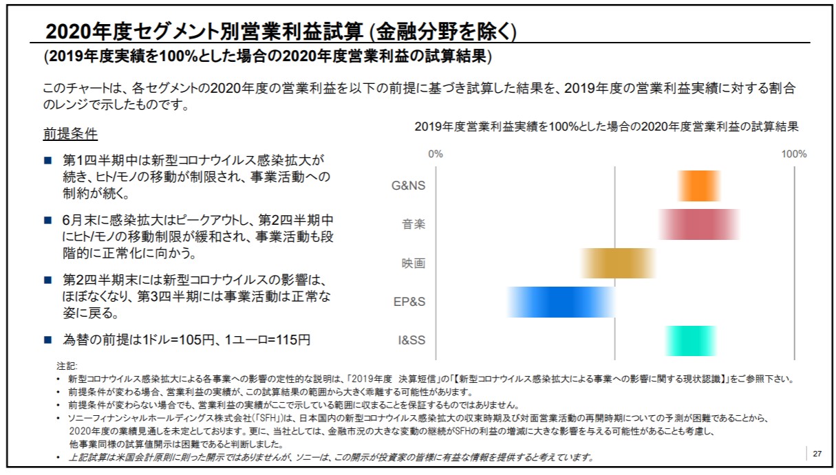上図のとおり、ソニーは幅を持たせた形で試算結果を示したうえで、「これらの前提にもとづく 2020年度(2021年3月期)の連結営業利益の試算結果は、現時点において、2019年度(2020年3月期)実績から少なくとも3割程度の減益となっています」と減益のスケール感も示している(ソニーの決算短信の24ページの補足情報)。ゴールドウィンやワールドのような“決め打ち”型の業績予想は困難でも、ソニーのように幅を持たせる方法であれば開示できると考える経営陣も少なくないだろう。