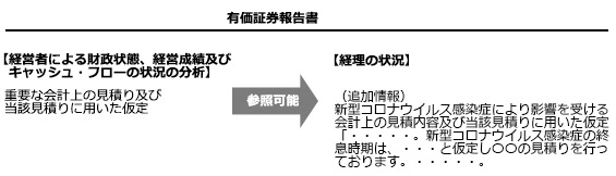 また、2020年4月2日のニュース「新型コロナウイルス感染症に言及した記述情報の開示例」でもお伝えしたとおり、2020年3月期の有価証券報告書から、【経営者による財政状態、経営成績及びキャッシュ・フローの状況の分析】(MD&A)において「重要な会計上の見積り及び当該見積りに用いた仮定」の開示が必要になる。新型コロナウイルス感染症の影響が重要であれば、「重要な会計上の見積り及び当該見積りに用いた仮定」ではこれを踏まえた記載が求められる。なお、記載すべき事項の全部または一部を「第5 経理の状況」の注記において記載した場合には、その旨を記載することによって、当該注記において記載した事項の記載を省略することができる。したがって、(追加情報)等で「重要な会計上の見積り及び当該見積りに用いた仮定」の内容が注記されていればMD&Aから参照することが可能となる(下図参照)。