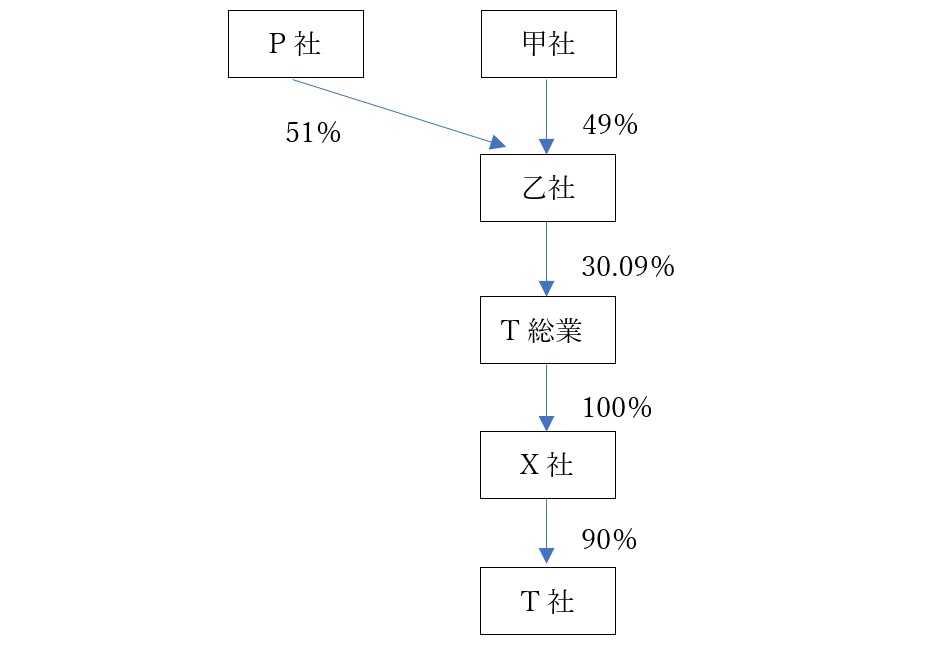 乙社の株式は長男が100%保有する甲社が「49%」、母が40%、長男・次男がそれぞれ30%保有するP社が100%保有するX社が「51%」保有していた。そこで、P社、甲社・乙社のすべてにおいて代表取締役を務めていた長男は、乙社を発行会社、甲社を引受人とする第三者割当増資を行うことを考案する。これが実現すれば、長男が100%保有する甲社が、T総業の筆頭株主である乙社の株式を過半数取得することができ、結果的にT社も支配することができるからだ。