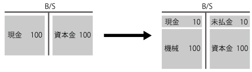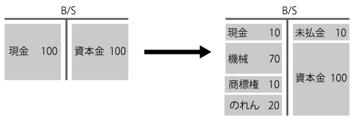 現金を100だけ有している企業が、他社からA事業を90で譲り受けた(支払いは現金で行った)。その際、機械100を取得するとともに、未払賃金10も引き受けた。