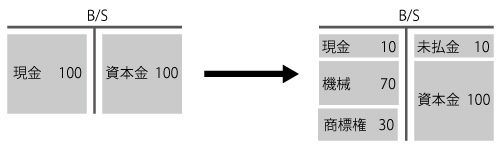 現金を100だけ有している企業が、他社からA事業を90で譲り受けた(支払いは現金で行った)。その際、機械70を取得するとともに、未払賃金10も引き受けた。PPAにより商標権を30見積もった(税効果は未考慮)。