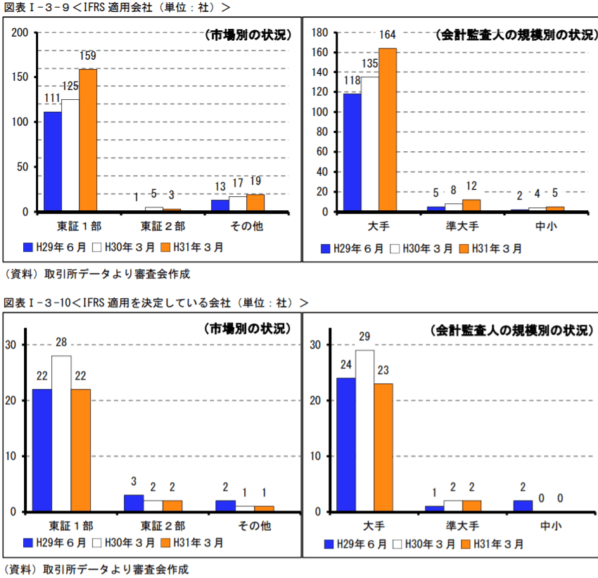 ただし、たとえ会社側にIFRSの採用意欲があっても、監査法人が中小規模の場合、監査法人から十分な支援を受けられないがゆえに、実際にIFRSに移行することには消極的にならざるを得ないケースもあるようだ。下表のとおり、IFRS適用企業の会計監査は大手監査法人の独壇場となっている(公認会計士・監査審査会が先月(2019年7月)30日に公表した「令和元年版モニタリングレポート」29ページより)。その理由として、IASやIFRSの基準書は原則主義で書かれており、その適用にあたっては解釈に委ねられる部分が少なくないため、海外も含め事例が集積している大監査法人の方が圧倒的に有利であることが指摘されている。
