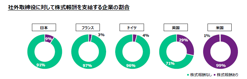 表1からは、米国の高さとフランスの低さも目に付く。米国企業の社外取締役の報酬水準の高さは同国でも若干問題になっており、「社外取締役の報酬総額に上限を設けるべきではないか」といった論調もみられる。ただ、表2のとおり、米国企業のほとんどが社外取締役に株式報酬を付与しており、上表の「3,200万円」という金額の半分以上は株式報酬であるため、キャッシュの報酬額は欧州や日本の企業と大差はない。フランスについては、調査対象となった企業のデータにバラツキがあるため、たまたま中央値が低めに出ているということのようだ。