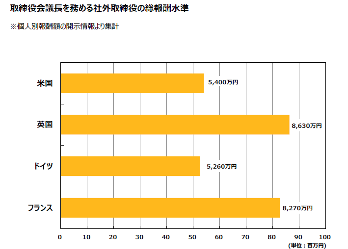 日本企業の社外取締役の報酬は英国企業と同じ金額となっており、既に“グローバル水準”に到達していると言ってよいだろう。専門家からも、「社外取締役の拘束日数が月1~2日ということを踏まえても、ベースの報酬額はこれ以上増やすべきではない」という見解が聞かれる。ここで「ベースの報酬額」としたのは、例えば取締役会議長(後述)、報酬委員会や指名委員会(任意のものを含む)をはじめとする委員会の委員長など、ほぼ常勤並みのコミットメントが求められる場合には、当然ながらその拘束時間や責任に応じて報酬額も増えるためだ。