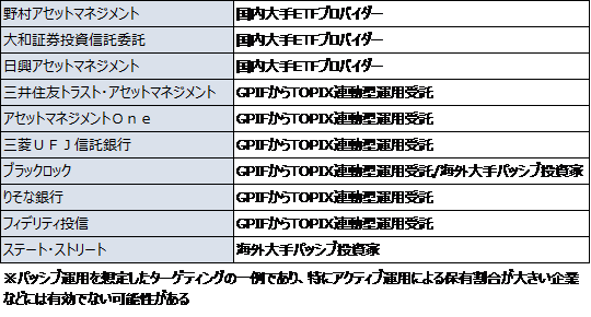 また、パッシブ運用の資産額が大きい投資家を中心に対話を進めていくことも考えられます。東証一部上場企業(=TOPIX構成銘柄)を想定した場合、例えば【表2】の10の投資家をターゲットにする方法があり得ます。