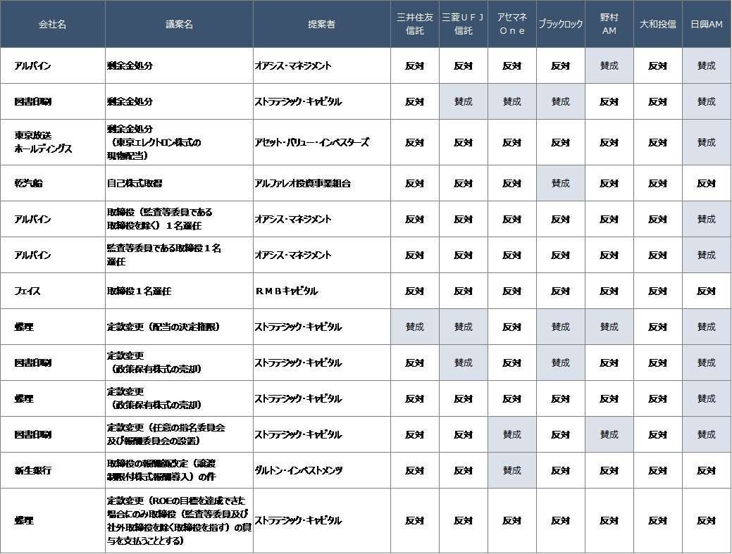 【表1】昨年6月開催の株主総会におけるアクティビスト提案議案と国内機関投資家の賛否