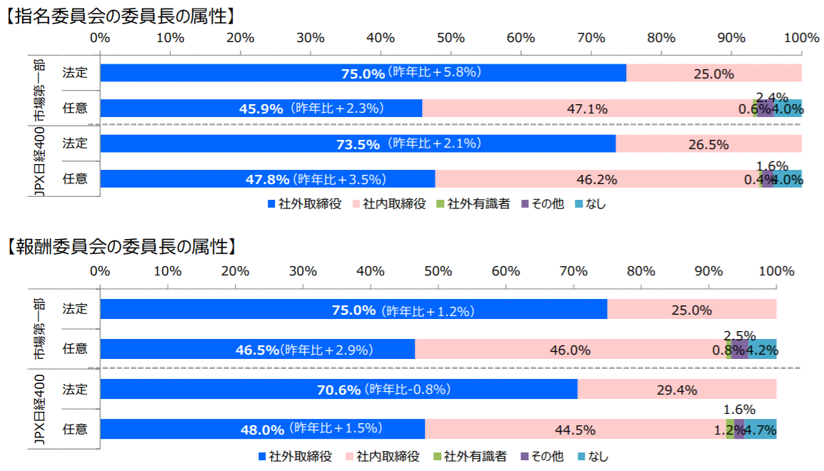 任意の委員会で社内取締役が委員長を務める企業の多さからは、CGコードの改訂を受け急ごしらえで任意の委員会を作ったものの、激変緩和の観点からひとまず委員長は社内取締役にして様子を見ようという企業(監査役会設置会社、監査等委員会設置会社)側の思惑も透けて見える。任意の委員会の設置が一巡した後は、投資家の関心が委員長の属性の妥当性に移行することは間違いないだろう。