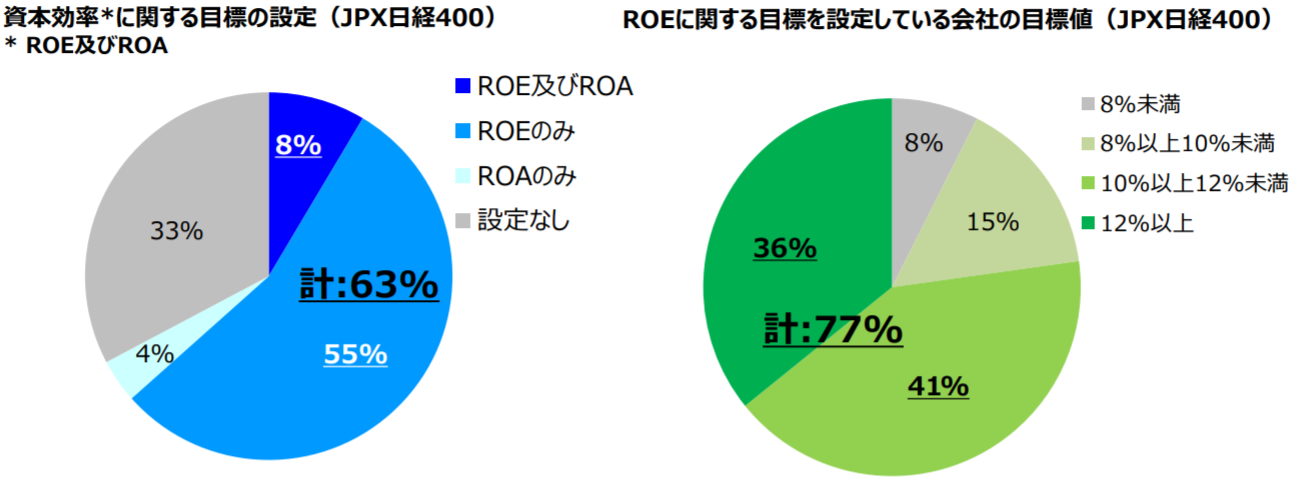 また、ROEに関する目標を設定しているJPX日経400銘柄のうちの77%が「ROE10%以上」を目指していることも分かった。JPX日経400銘柄においては、二桁のROEを目標にするのはもはや当然になりつつあると言えよう。その一方で、JPX日経400を構成する銘柄であっても、伊藤レポートが最低限コミットすべきとする「8%」に達しない数字をROEの目標に設定している企業も全体の8%あった。JPX日経400銘柄の大部分が10%以上のROEを目標に掲げる中、低ROEを目標とした企業に対しては、投資家からROE向上に向けプレッシャーが強まることになりそうだ。