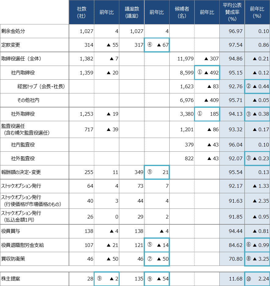 「2.議決権行使結果から見る議案別傾向 (1)役員選任議案」で述べたとおり、本年6月総会では、特に経営トップの選任議案に対する賛成率の低下が確認されました。これは、会長や社長個人の資質を問うというよりは、会社の資本効率性(ROEなど)やガバナンス体制(取締役会の構成など)に対する株主の不満が経営トップの選任議案に向かったケースが多かったためと考えられます。また、機関投資家協働対話フォーラムが集団的エンゲージメントにおいて経営トップの選任議案への反対理由の分析を求めているのは、経営トップの選任議案への反対の背景には何らかの経営課題が存在すると考えているためであると推測されます。企業が株主との対話を進めていく上で、「反対の理由・原因の分析」への取り組みの重要性が増してきていると言えます。