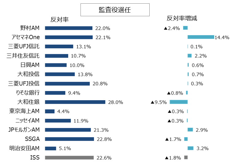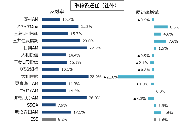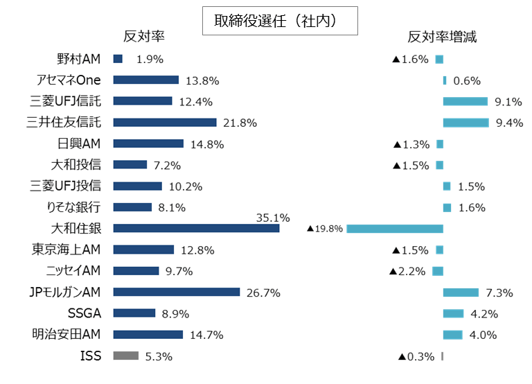 また「2.投資家別の反対率分析(役員選任議案)」では、取締役選任議案について、ISSの反対推奨率よりも国内機関投資家の反対率の方が高い傾向が見られる点を確認しました。これは、議案によっては、海外機関投資家よりも国内機関投資家の方が、厳しい議決権行使を行う場合もあることを示しています。もっとも、国内機関投資家の賛成率は投資家毎に大きく異なっています。株主総会に上程する議案について、多くの株主から賛同を得て、高い賛成率で可決させるためには、「自社にとって賛成率に与える影響が大きい投資家」を中心に、賛否の判断基準やその背景にある考え方を理解することが必要です。