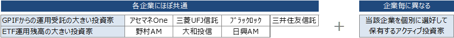 その一方で、国内市場においてパッシブ運用の比重が高まっていることに伴い、「特定の大手機関投資家」が多くの企業にとって「賛成率に与える影響が大きい投資家」となってきているということも事実です。例えば、年金資金の運用については、国内最大の資金の出し手であるGPIF(年金積立金管理運用独立行政法人)が国内株式運用資産残高約41兆円のうち約37兆円をパッシブ運用に振り向けており、中でもTOPIX(東証株価指数)連動型の運用資産残高は約27兆円に上っています。GPIFからTOPIX連動型運用を受託しているのは、アセットマネジメントOne、三菱UFJ信託銀行、ブラックロック・ジャパン、三井住友信託銀行(本年10月に三井住友トラスト・アセットマネジメントが三井住友信託銀行の資産運用機能を統合)の4社となっています。また、投資信託においては、日銀が金融緩和策の一環として、日経平均株価やTOPIXなどの指数連動型の上場投資信託(ETF=Exchange Traded Funds)の購入を続けていることから、ETF運用残高の大きい野村アセットマネジメント、大和証券投資信託委託、日興アセットマネジメントの3社の存在感が大きくなってきています。これらの大手機関投資家7社は、多くの企業にとって「賛成率に与える影響が大きい投資家」に当たる可能性が高く、賛否の基準や議決権行使結果を把握することが望ましい先であると言えます。