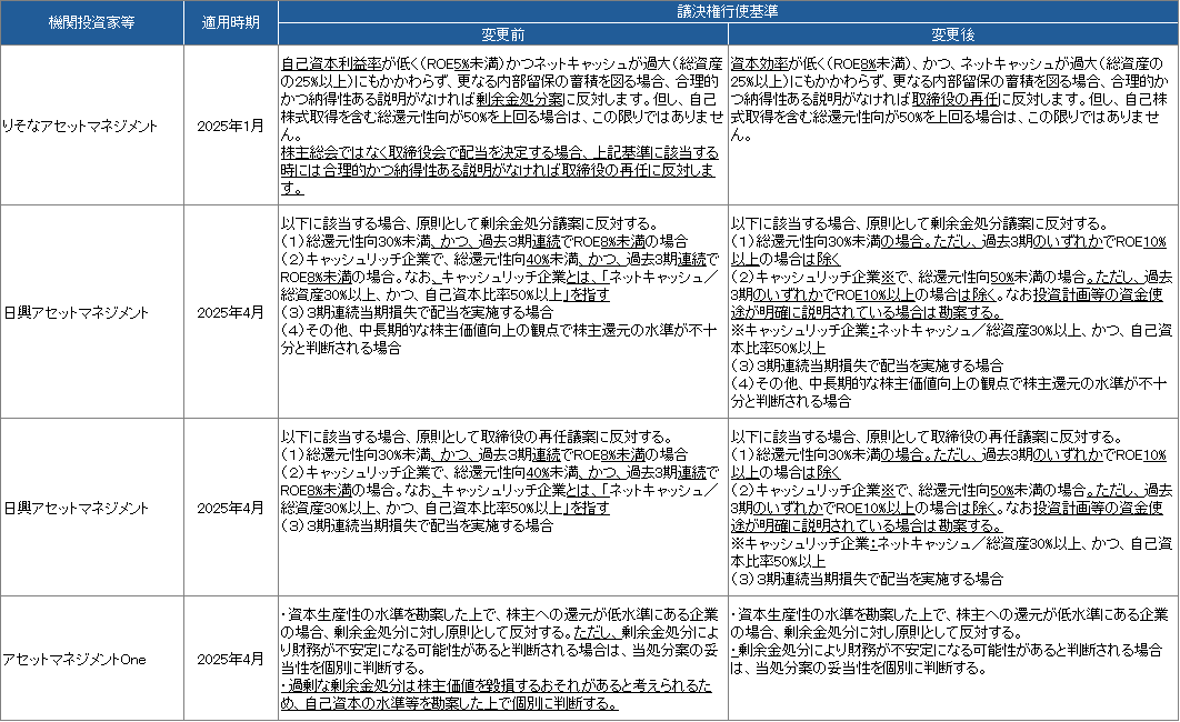 配当基準の厳格化も続いています。機関投資家の配当基準は総還元性向とROE、ネットキャッシュ比率などの財務状況の組み合わせで構成されるのが一般的ですが、本年はりそなアセットマネジメントがROEの閾値、日興アセットマネジメントが総還元性向の水準をそれぞれ引き上げています。