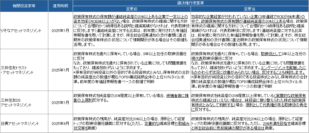 2025年6月の株主総会シーズンに向けて、国内主要機関投資家の新たな議決権行使基準が出揃いました。本稿では以下の機関投資家の議決権行使基準の改定内容をテーマごとに解説します。