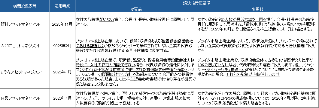 昨今は米国を中心にDEI(Diversity, Equity, Inclusion:多様性、公平性、包摂性)への逆風が吹いていますが、国内機関投資家が企業に対して女性取締役選任を求める動きは進んでいます。野村アセットマネジメントやりそなアセットマネジメントは従来の「1名」との基準を「10%」に厳格化しています(野村アセットマネジメントは本年11月以降適用開始)。さらに日興アセットマネジメントはTOPIX500構成企業を対象に、2026年4月以降女性取締役が「2名未満かつ15%未満」の場合には経営トップの選任議案に反対するとしています。