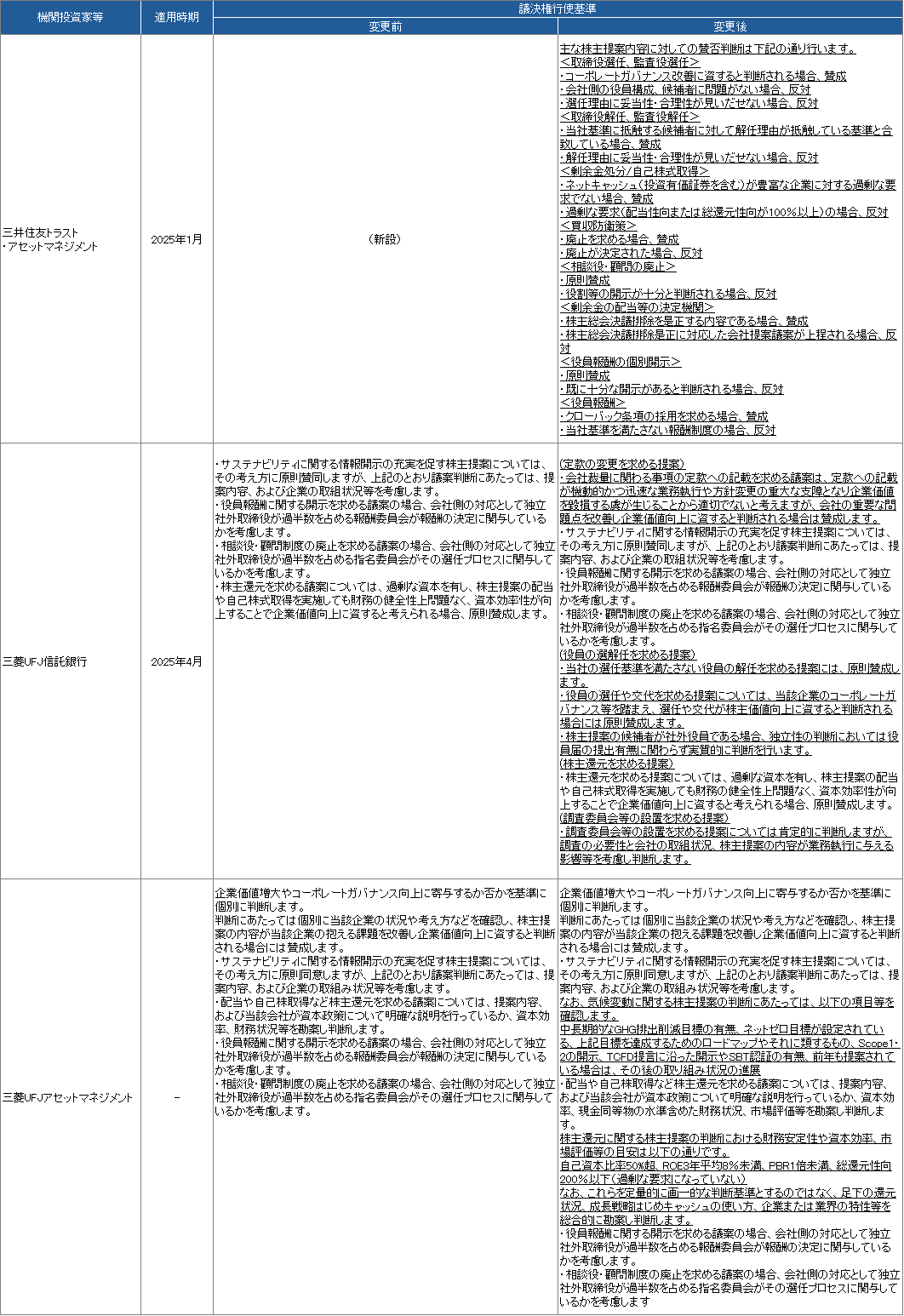また、本年主要な基準改定がなかった三菱UFJ信託銀行と三菱UFJアセットマネジメントも株主提案に関する基準の記載については充実させています。たとえば三菱UFJ信託銀行は、調査委員会等の設置を求める株主提案の判断にあたっては、調査の必要性や会社の取組状況、提案内容が業務執行に与える影響等を考慮することを明らかにしています。また、三菱UFJアセットマネジメントは、株主還元を求める提案を判断する際の目安として自己資本比率50%超、ROE3年平均8%未満、PBR1倍未満、総還元性向200%以下を挙げつつ、企業または業界の特性等を総合的に勘案するとの方針を示しています。