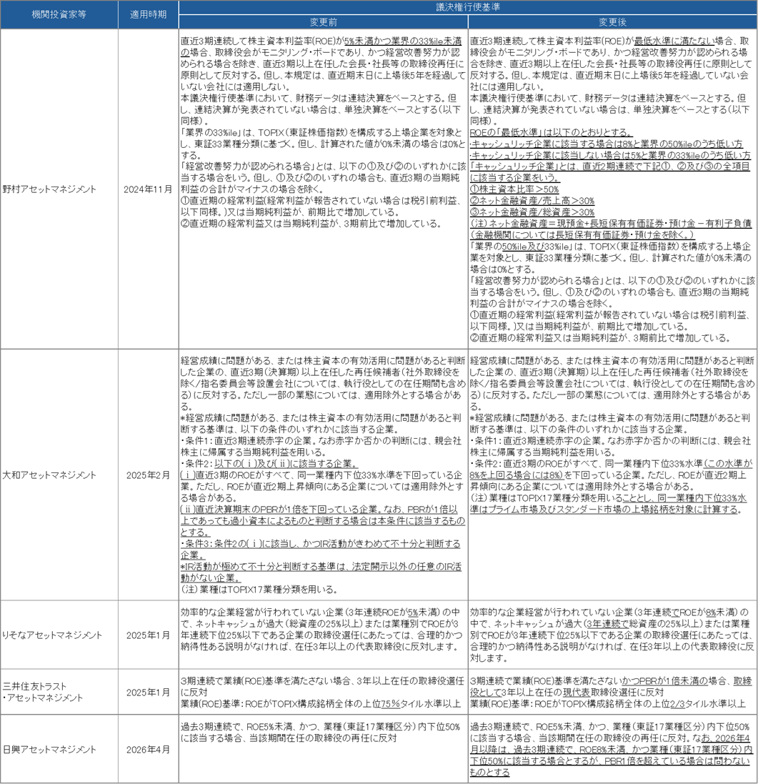 業績基準の厳格化は、議決権行使助言会社ISSがコロナ禍で停止していたROE基準(5年平均5%未満かつ直近5%未満で経営トップに反対推奨)を復活させた昨年から続いていますが、本年は「8%」に設定する投資家が多く確認されています。例えば野村アセットマネジメントは、キャッシュリッチ企業に対して「8%と業界の50%ileのうち低い方」を求めるとの基準を導入しています。りそなアセットマネジメントや日興アセットマネジメントでも、「5%」から「8%」への引き上げが確認されます(日興アセットマネジメントは2026年4月より厳格化)。また、大和アセットマネジメントのROEの閾値は「同一業種内下位33%水準」ですが、ここに「この水準が8%を上回る場合には8%」との記載が加わっています。